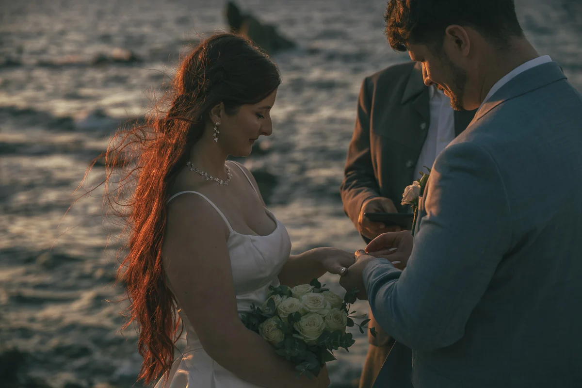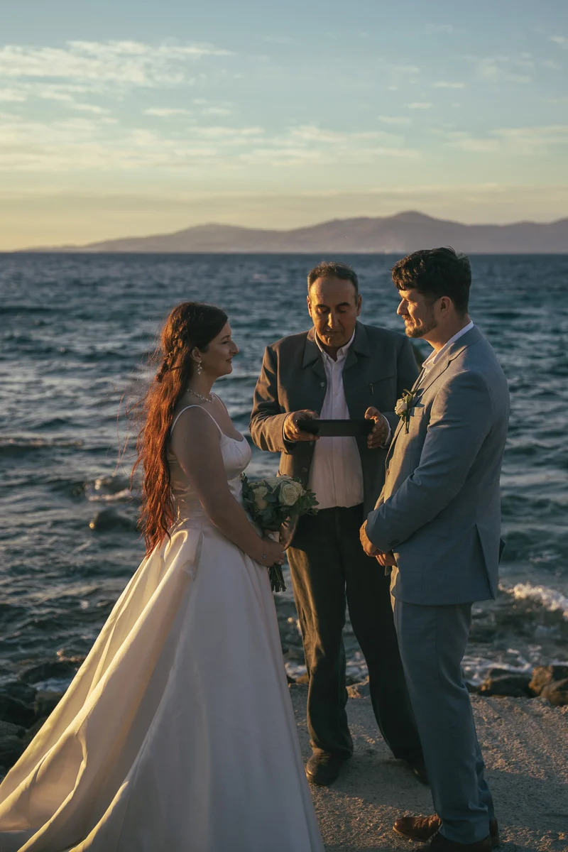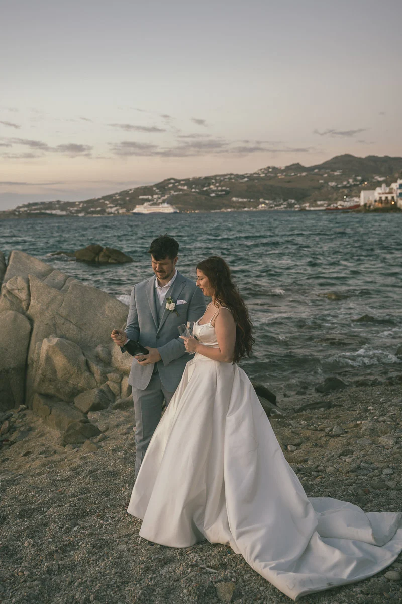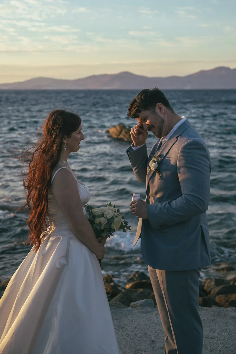 As the sun began its descent over the Aegean, Devin and Daniel made their way to the water’s edge at Little Venice. With the whitewashed houses of Mykonos reflected in the waves and the last golden light of October wrapping around them, they stood face to face and read the vows they had written for each other. Just the two of them, the wind in Devin’s hair, the sound of the sea — and words that had been waiting to be said. Daniel slipped the ring onto Devin’s finger, and in that moment, everything was exactly as it was meant to be. They celebrated with a glass of champagne on the rocks, laughing, newly married, with all of Mykonos as their witness.