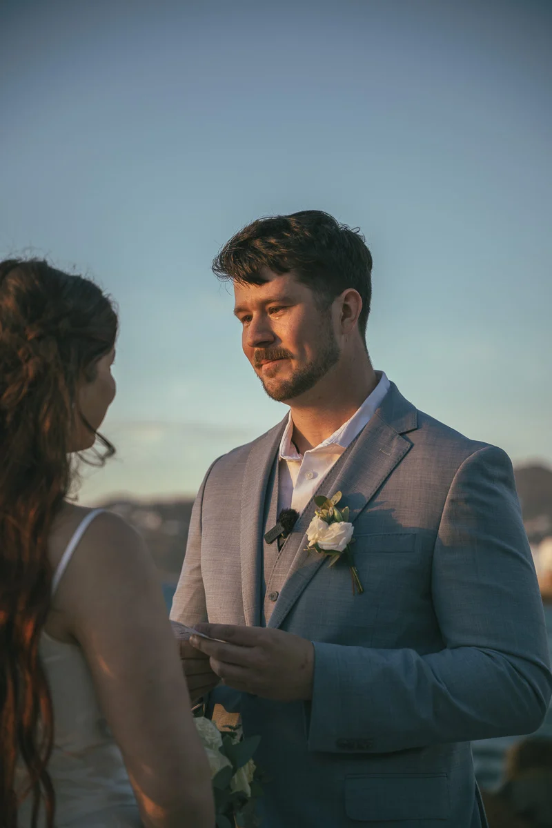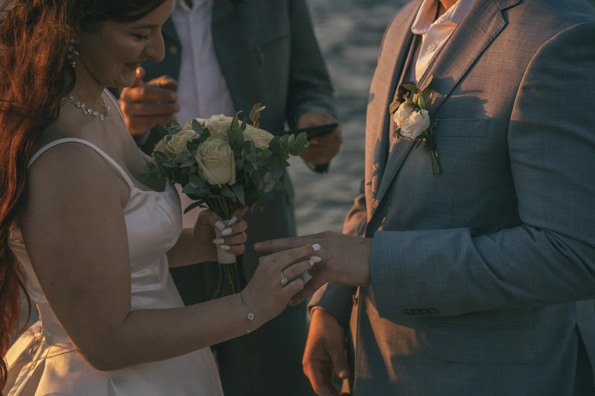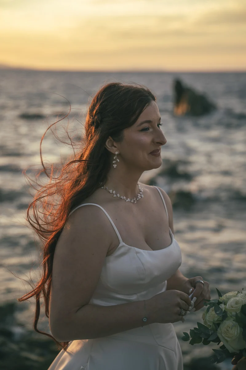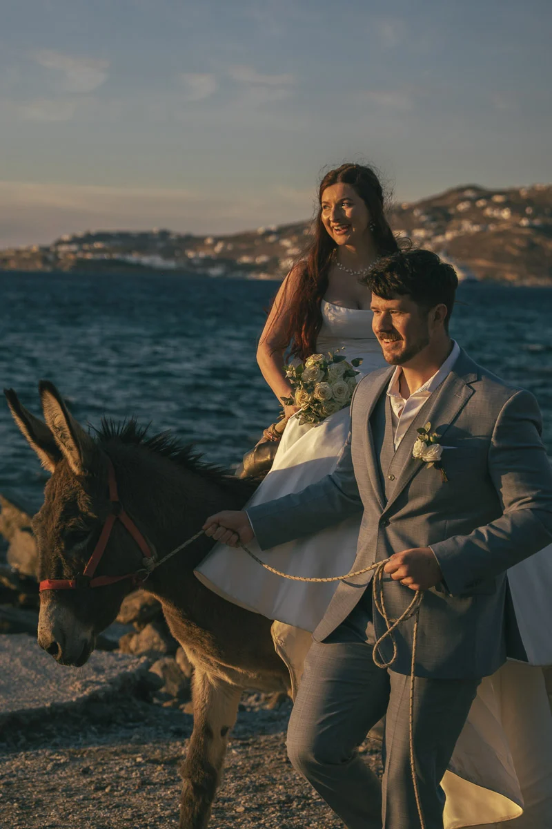 As the sun began its descent over the Aegean, Devin and Daniel made their way to the water’s edge at Little Venice. With the whitewashed houses of Mykonos reflected in the waves and the last golden light of October wrapping around them, they stood face to face and read the vows they had written for each other. Just the two of them, the wind in Devin’s hair, the sound of the sea — and words that had been waiting to be said. Daniel slipped the ring onto Devin’s finger, and in that moment, everything was exactly as it was meant to be. They celebrated with a glass of champagne on the rocks, laughing, newly married, with all of Mykonos as their witness.