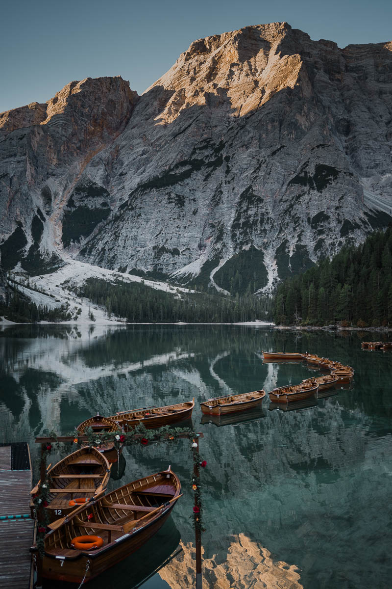Among all Dolomite destinations, Lake Braies stands out as a breathtaking setting for a micro wedding or an elopement in the Dolomites. Its turquoise water, wooden boats, and dramatic mountain backdrop create a fairytale atmosphere that feels untouched and deeply romantic. A micro wedding at Lake Braies is ideal for couples who want beauty, authenticity, and a peaceful alpine vibe. Whether photographed from the iconic wooden pier or along the forested paths surrounding the lake, every moment becomes a piece of art.
