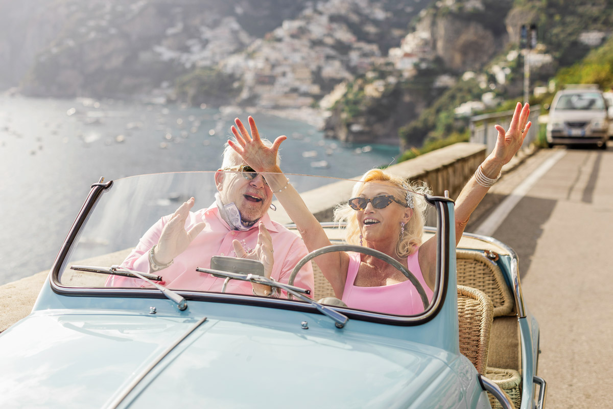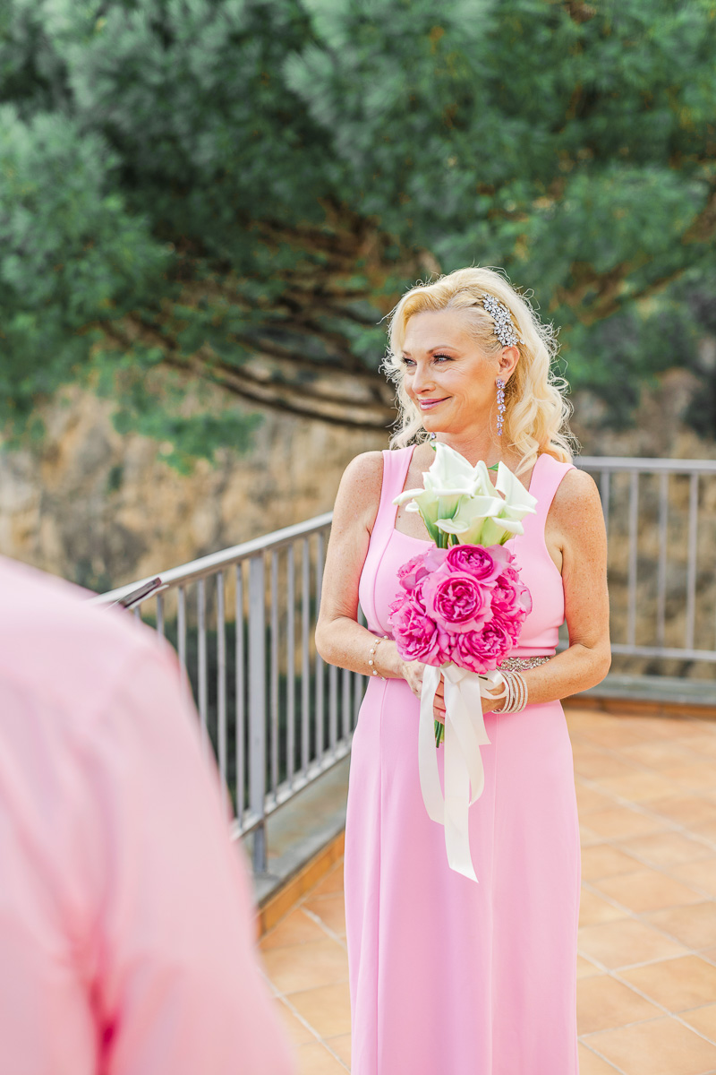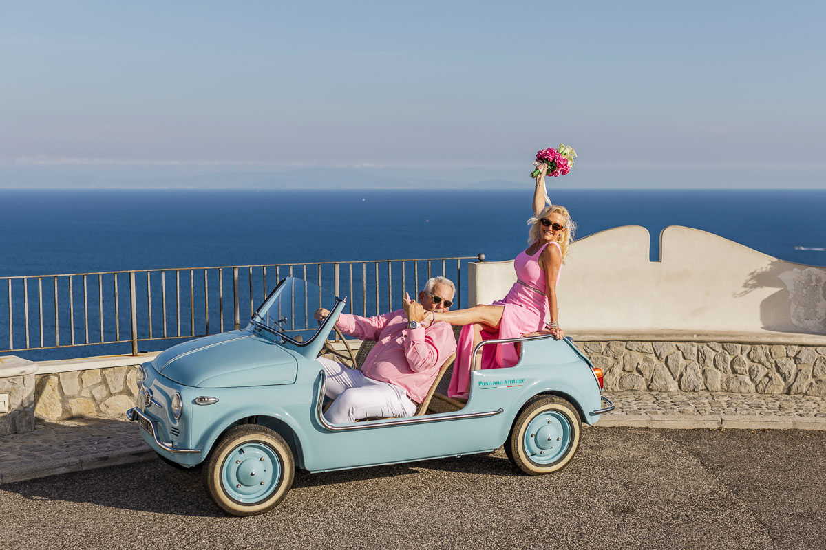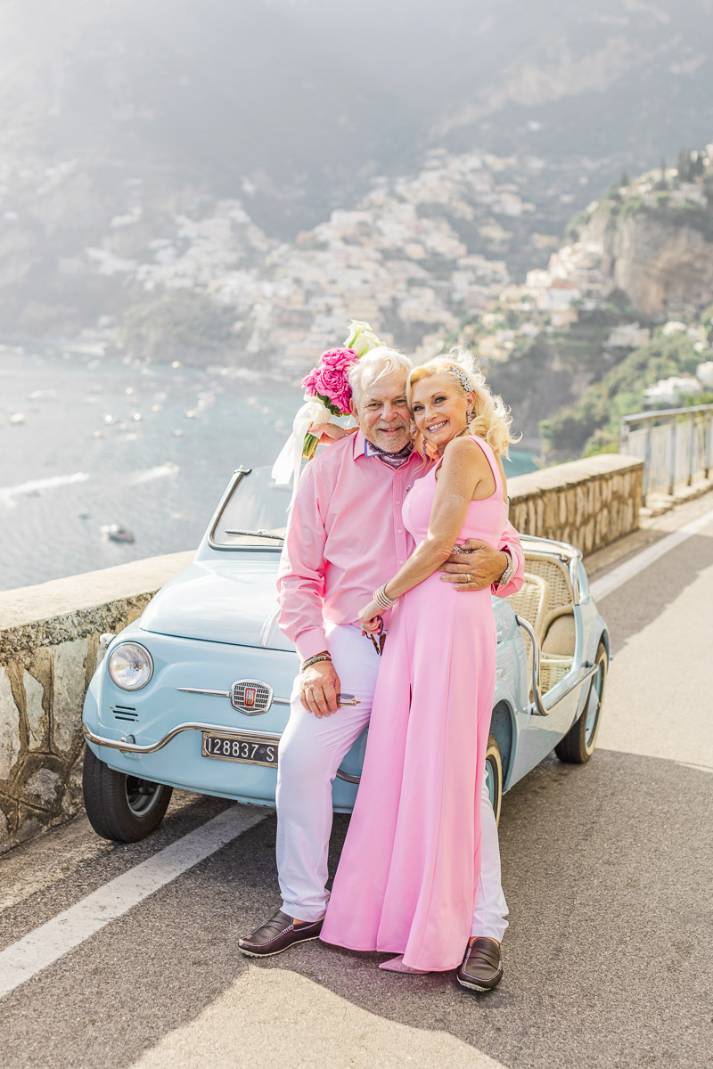 After renewing their vows on their private terrace, Diane and Bill transformed the winding coastal roads of Positano into their personal celebration. Their post-ceremony photo shoot captured the pure joy of a couple who knows that the best adventures are the ones you share together. Against the endless blue of the Mediterranean and the dramatic Amalfi Coast cliffs, they posed with a vintage baby blue convertible that perfectly complemented their coordinating pink outfits—a playful touch that showed their willingness to embrace la dolce vita with style and a sense of fun.