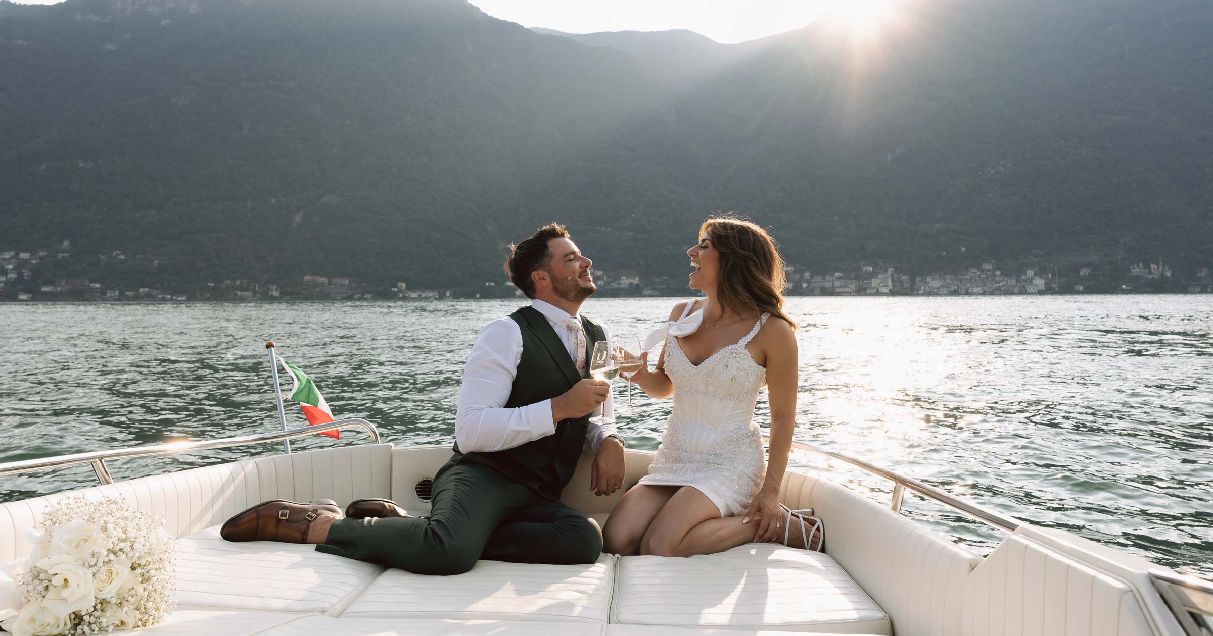 After the “I do’s,” you and your guests step aboard a luxury Lake Como wedding boat, gliding across the serene water. The boat ride not only offers a magical experience but also becomes the perfect opportunity for an intimate, sun-kissed photo session. Your photographer captures candid moments as the light reflects off the lake, casting a romantic glow over the newlyweds and their celebration.