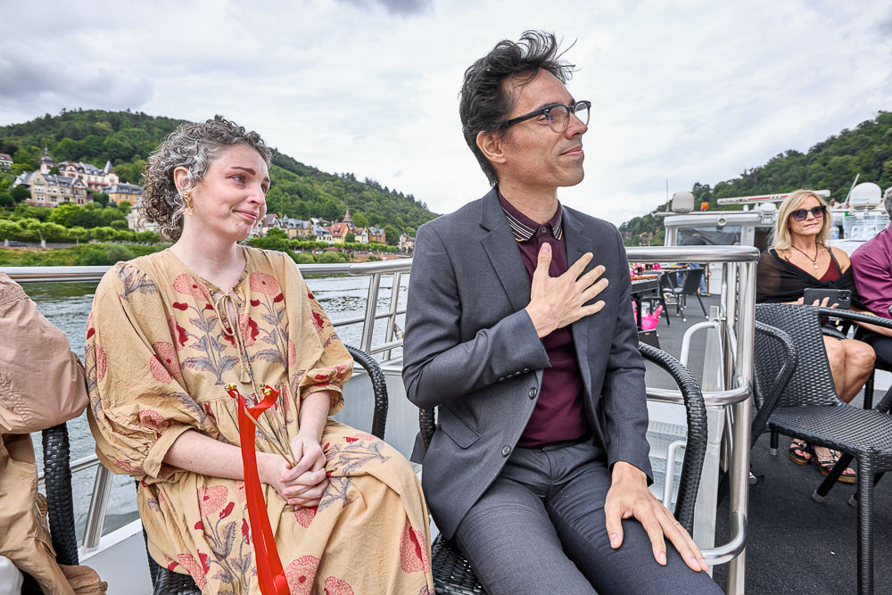 As the boat made its way back toward the pier, the celebration continued. Champagne glasses clinked, a tiered cake with seasonal berries was shared, and the gentle rocking of the boat kept everyone in a relaxed, joyful rhythm. The combination of Heidelberg’s scenery, the intimacy of a micro vows renewal, and the unique charm of a river setting created a celebration that felt as effortless as it was unforgettable.
